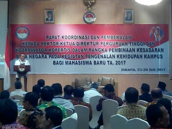 Hal itu merupakan salah satu penekanan dalam pengarahan Menteri Pertahanan Ryamizard Ryacudu. Rabu (26/7) di Kantor Kemhan, Jakarta, dalam Rapat Koordinasi Pembekalan kepada Para Rektor/Ketua/Direktur dan Koordinator Kopertis Perguruan Tinggi, dalam rangka Pembinaan Kesadaran Bela Negara (PKBN) bagi Mahasiswa Baru Tahun 2017.