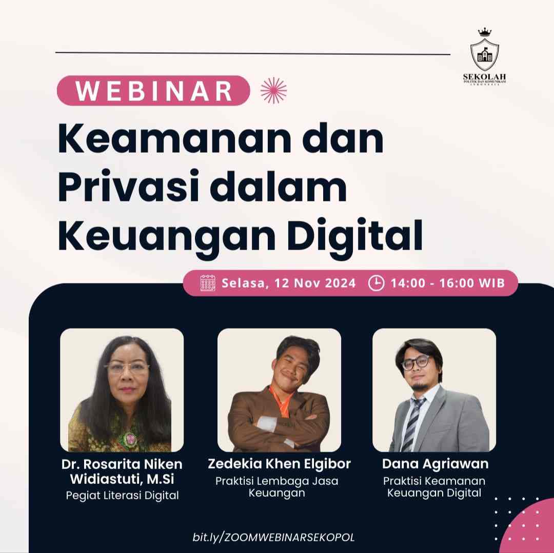 Sekolah Politik dan Komunikasi Indonesia bekerja sama dengan Kementerian Komunikasi dan Digital (Komdigi) terus berkomitmen meningkatkan literasi digital masyarakat, di antaranya melalui gelaran webinar bertema “Keamanan dan Privasi dalam Keuangan Digital”.